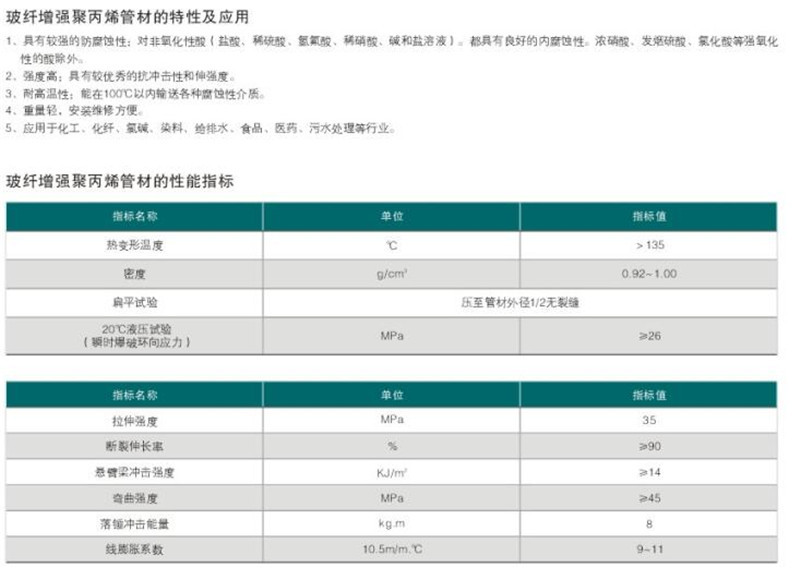 FRPP管性能特點:長久的使用壽命,FRPP管材可安全使用50年以上;的耐腐蝕性能;優異的抗磨性能;較高的剛度;耐熱保溫節能;可靠的連接性能;良好的施工性能-----FRPP管材質輕,焊接工藝簡單,施工方便,工程綜合造價低。